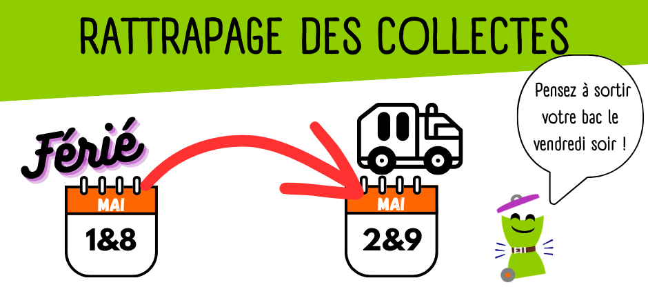 Le vendredi 1er mai 2026, ainsi que le vendredi 8 mai 2026 seront fériés. Les collectes ne seront pas assurées ces jours mais seront rattrapées le samedi 2 et le samedi 9 mai 2026 respectivement.