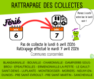 Le lundi 6 avril 2026 sera férié, les collectes ne seront pas assurées ce jour mais seront rattrapées le mardi 7 avril 2026.